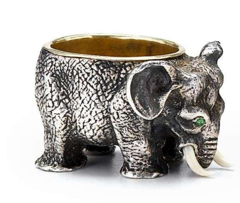 Mounted with ivory tusks and green gem-set eyes and a silver gilt insert, marked in Cyrillic for Faberge with assay mark for 1894 and assay master Lev Oleks.