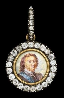 Petite transfer printed sepia portrait of Tsar Peter the Great (1672-1725) framed by twenty-eight Old Mine cut diamonds, reverse displays a yellow gold monogram.