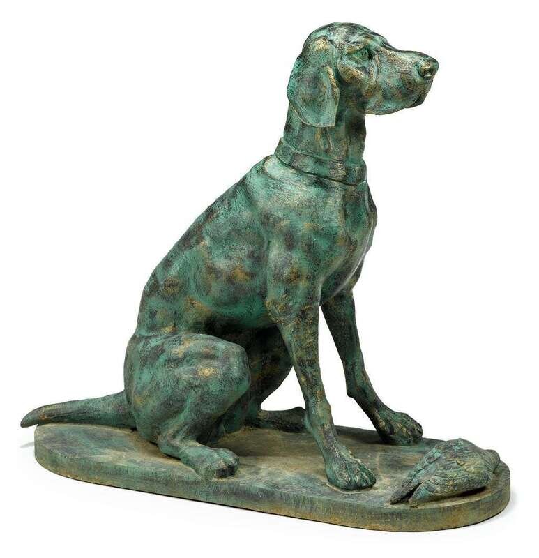 Verdigris patina on gilt ground, depicting a seated hound with a game bird at his feet, on oval base.