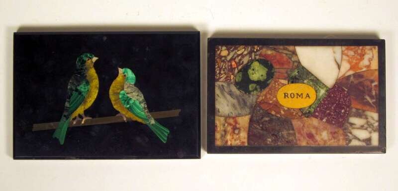 One depicting a pair of chaffinches on a branch inlaid with malachite and yellow quartz, the other a marble specimen panel inlaid with various marbles surrounding a central plaque "Roma".