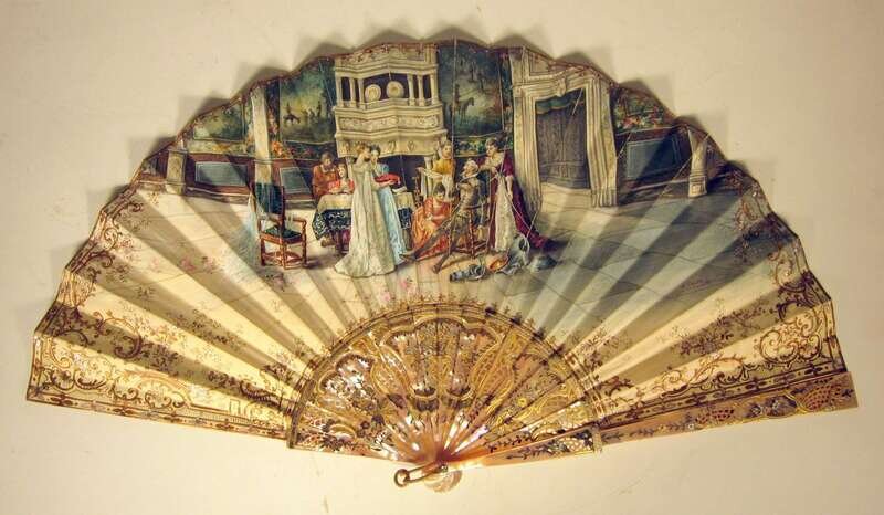 One probably Spanish, painted on one side with a scene from Don Quixote, signed "J. Salva", the other side painted with windmills, the mother of pearl handles decorated in openwork with gilt highlights. Together with seven other fans, six hand-colored, one embroidered with ivory handles. (8).