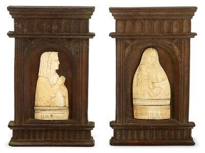 Gothic revival, two ivory Christian figures laid down on carved wood frames, one reads 'O MATER ALMA, CHRISTI,' the other, 'O BENIGNA'. (2).