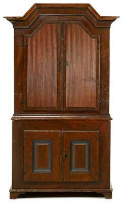 Two parts, the top with arched molded cornice over two paneled doors, opening to reveal two shelves, above base with two cupboard doors, raised on bracket feet.
