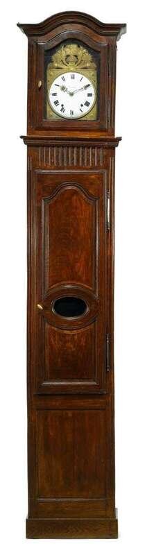 The arched glazed cornice over white enameled dial within gilt metal face, above conforming long case with tall door, raised on plinth base.
