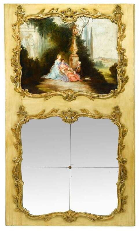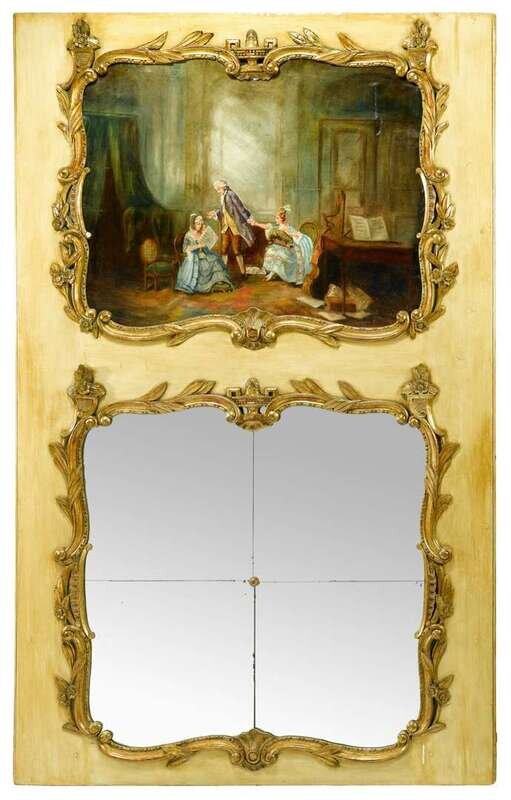 Tall rectangular form, with a painted scene within mounted border of gilt foliate scrolls and sprigs, above a four plate mirror within a similar border, on cream painted ground.