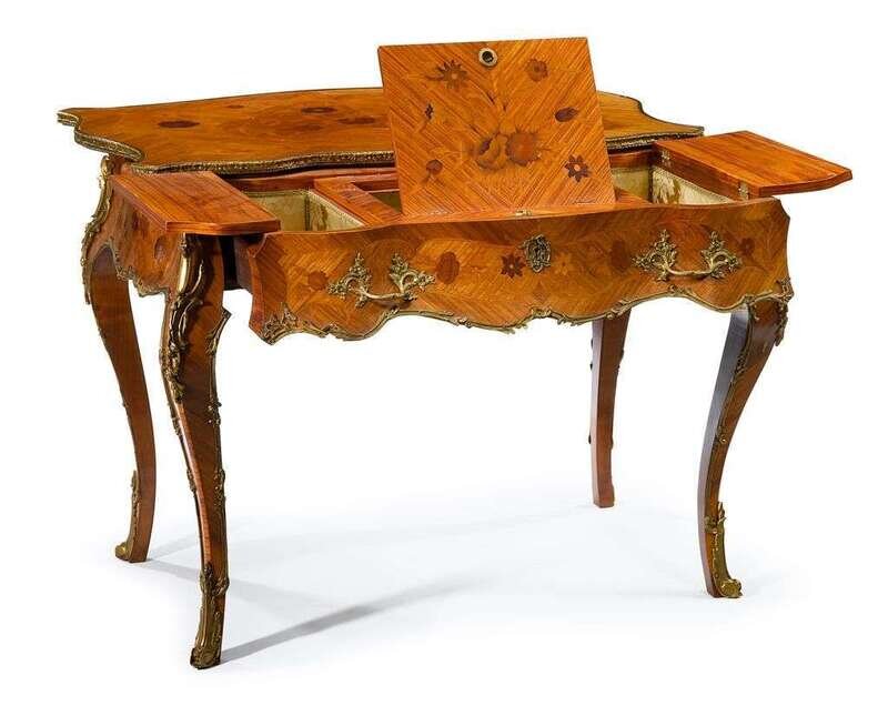 The sliding shaped bronze-banded rectangular top with C-scroll and foliate marquetry, above a slide out drawer fitted with a lift-up writing slope and two side compartments, raised on cabriole legs ending in sabots.