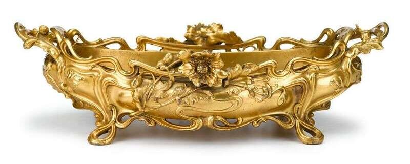 Heavily cast to show intertwining floral stems, leaves, flowerheads and scrolling handles, the central recess with lift out tray.