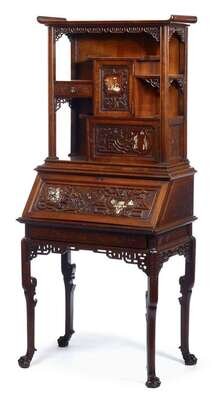 Two parts, the shaped pagoda-like top over fret apron above central cupboard doors all above pull drawer slope front writing surface, opening to reveal an interior of two short drawers, over single long drawer, raised on fret joined cabriole legs, terminating in paw feet.