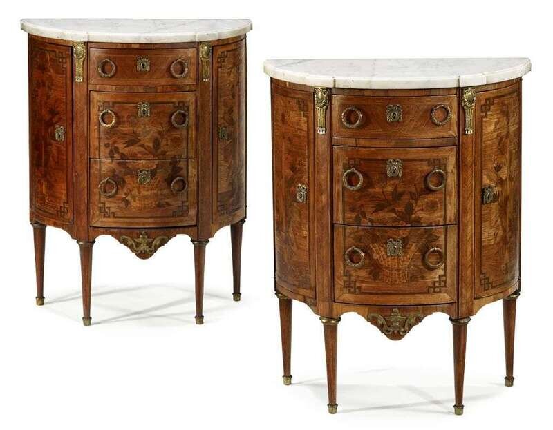 Pair of French Transitional kingwood and marquetry demi-lune commodes