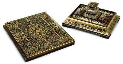 Comprising an inkstand with a single square glass inkpot flanked by two covered compartments and two pen trays, together with a folio case with a green moire silk liner. (2).