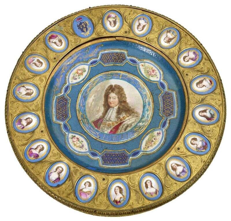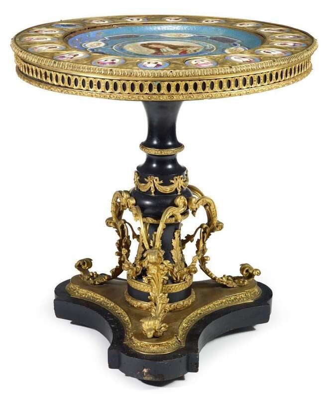 The circular top mounted with central porcelain charger, flanked by eighteen oval female plaques all on light blue ground, within worked gilt-metal beaded and cast edge, over ebonized baluster column, supported by triform base supporting gilt bronze cast foliate scrolls.