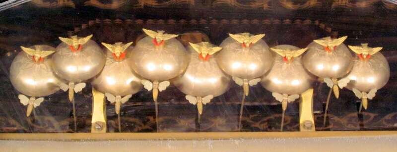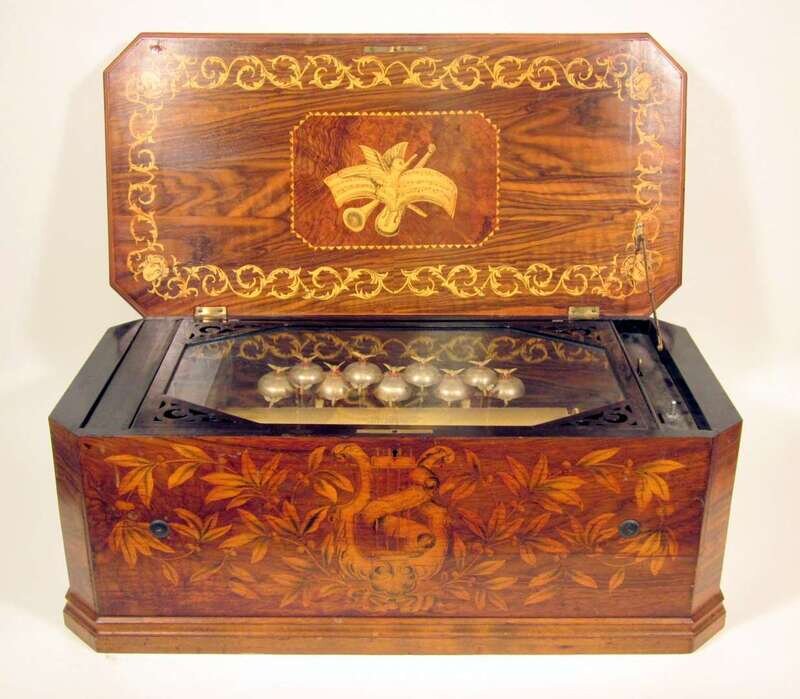 The marquetry case inlaid with floral sprays, musical instruments and animals, opening to a cylinder and nine bells mounted with birds, now wired for electricity.