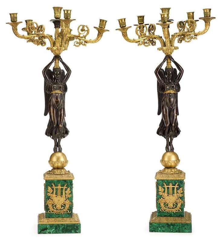 Impressive pair of French Empire style gilt bronze and malachite mounted candelabra late 19th century