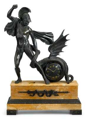 The rectangular Sienna marble base surmounted by the bronze figure of Perseus slaying a dragon, its coiled body enclosing the black enamel and gilt clock works.