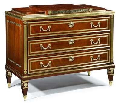 The stepped top with Greek key frieze above a brass banded molded edge over three long drawers with drapery swag handles, raised on square tapering brass capped feet.