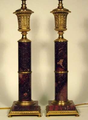 Pair of Louis XVI style gilt metal and rouge marble candlesticks