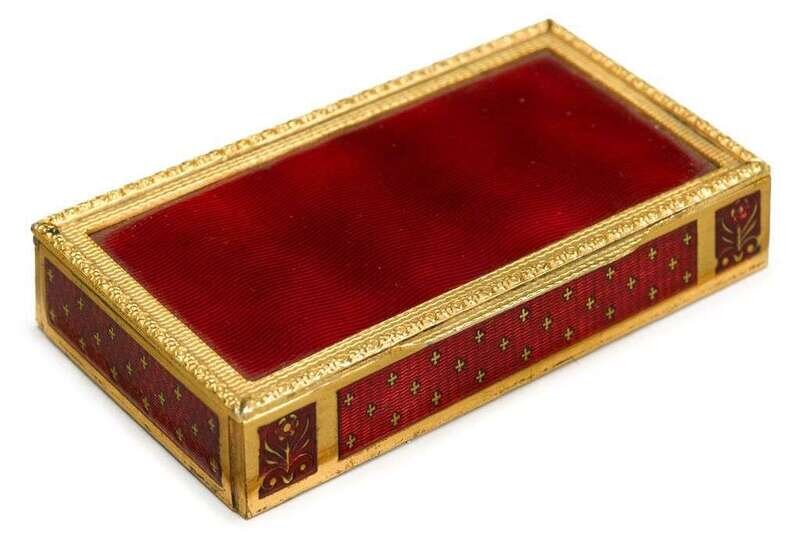 The rectangular top with foliate worked band enclosing red enamel conforming panel, over a base enameled with narrow alternating fleur de lis, terminating on woven pattern base.