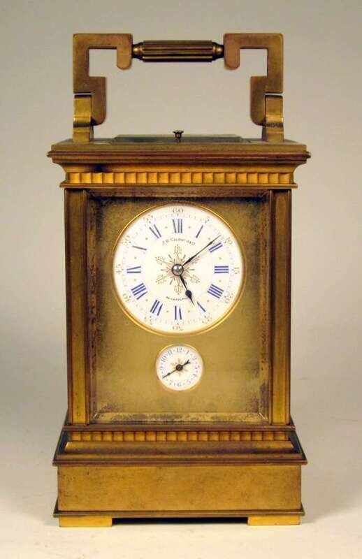 French brass and glass grand sonnerie repeating travel alarm clock late 19th century, retailed j.w.caldwell, philadelphia