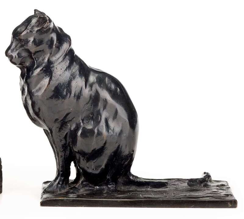 Bronze, modeled as a cat, dark brown patina, signed "G. Righetti" to base.