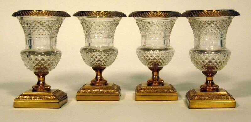The circular rim surmounts classical urn form glass base, raised on gilt metal foliate cast square base. (4).
