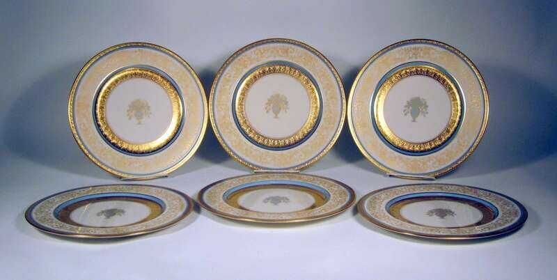 Circular form, central light blue and gilt decorated urn to center framed by foliate sprigs. (10).