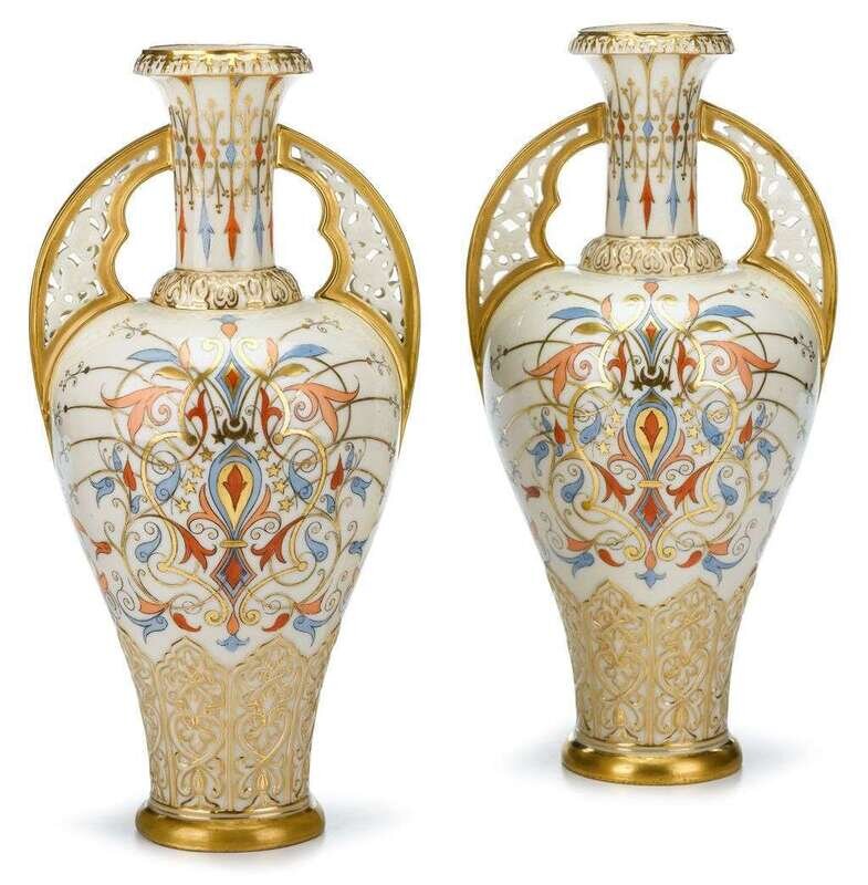 In the arabesque taste, painted with floral sprays, stars and arabesque motifs in colors and gilt on a white ground.