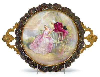 Painted with an eighteenth-century garden scene depicting a seated lady, a gentleman whispering in her ear, signed C. Rochette, set within a gilt metal cloisonne enameled mount.