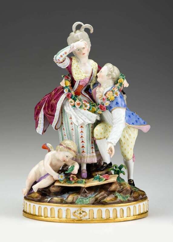 Modeled as a swooning lady supported by a young man whom she garlands with flowers, a putto at their feet placing roses on the broken planks, a figure of Cupid behind them, on a naturalistic rocky base with molded neoclassical border heightened in gilt, underglaze blue crossed swords mark, incised mark F63.