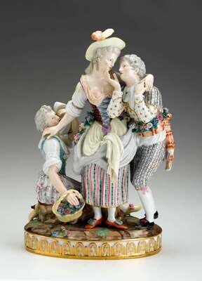 Modeled as a young woman being courted by a lover as another is spurned, on an oval base, the molded border with gilt acanthus stiff-leaf tips, blue crossed swords and incised marks.