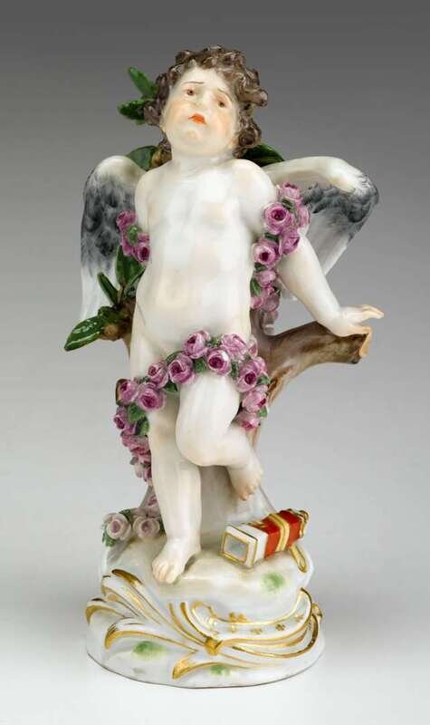 Modeled as a sad-faced cupid bound to a tree by a garland of roses, his quiver by his feet, on a gilt-scrolled rococo base, underglaze blue crossed swords mark, incised mark R123.