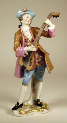 Modeled as a young man in brown coat playing a lute, on a naturalistic base with gilt rococo scrolls, underglaze blue crossed swords mark.
