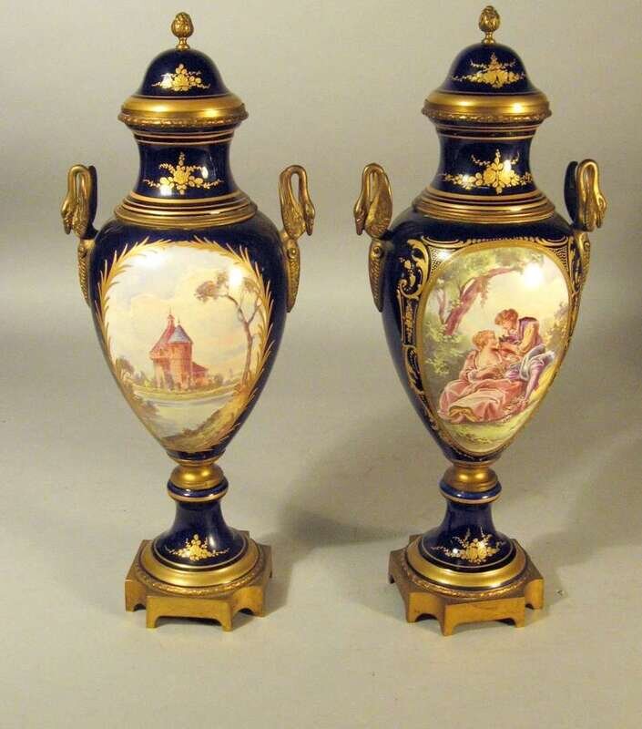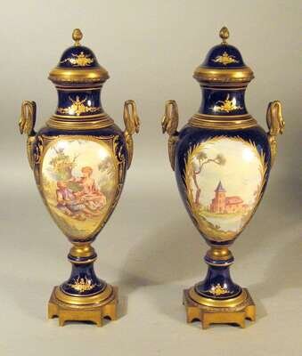 Pair of Sevres style gilt metal mounted porcelain covered urns