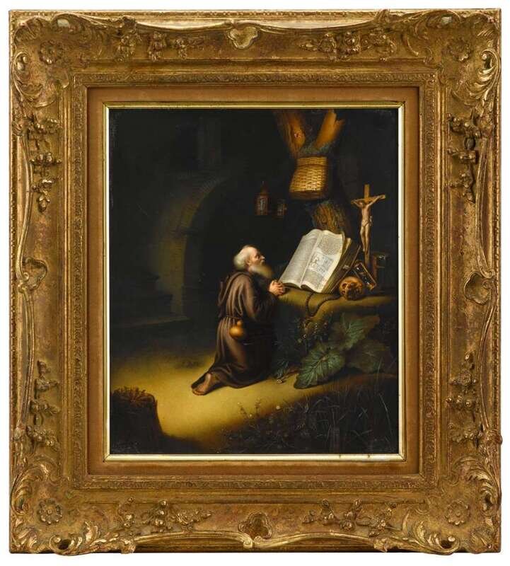 The rectangular plaque with a painting depicting St. Jerome kneeling in a courtyard, praying before a large tome, a skull, rosary and a Corpus Christi, impressed marks on verso, in a carved giltwood frame.