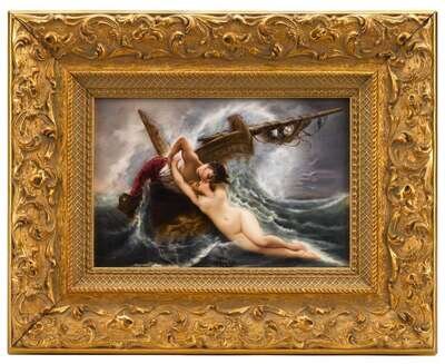 Depicting a nude woman being kissed by an amorous male, before a shipwreck in a stormy sea with waves crashing, impressed KPM and scepter marks, incised numerals on verso, in a molded giltwood frame.