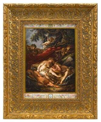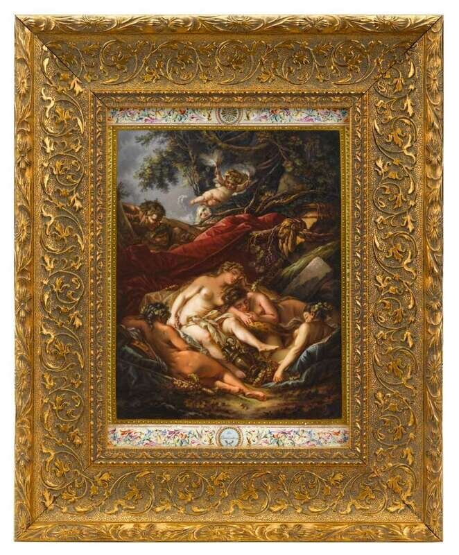 The rectangular plaque depicting four female nudes reposing in a woodland scene, surrounded by grapes, a tambourine and a wine ewer, as two satyrs look on, the painting within a finely executed border composed of floral scrolls and birds in various colors on a yellow ground with highlights in gilt, titled in gilt within small roundel at lower margin, impressed "CF" and inscribed beehive mark on verso, in a giltwood frame.