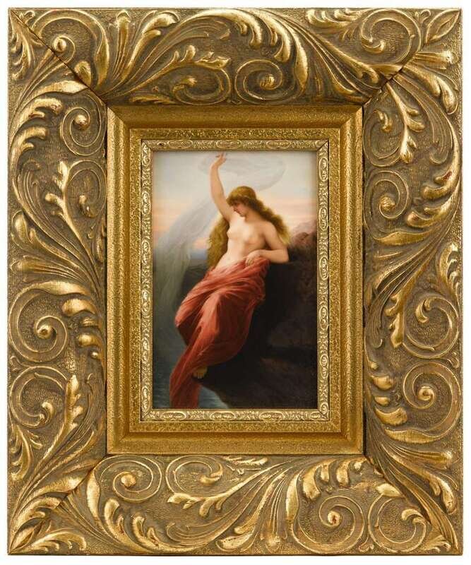 The rectangular plaque depicting a semi-nude Lorelei with long flowing hair, perched on a rock overlooking the sea, swirling a diaphonous cloth above her head, red robes draped around her waist and legs. Impressed KPM and scepter marks on verso, in an acanthus scrolled giltwood frame.