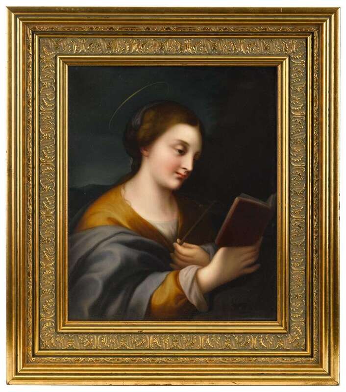 The rectangular plaque depicting St. Joan reading, a cross in her left hand, impressed marks and scepter marks on verso, in a pressed giltwood frame.