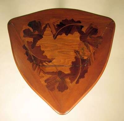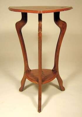 The shaped triangular top with foliate inlay and signature over conforming tier, raised on slender fluted cabriole legs.
