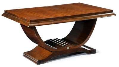 The rectangular top with wide molded edge, over U-shaped support terminating on lyre shaped feet.