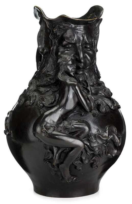 Dark brown patina, of handled jug outline, the front cast with a mask and female beauty over ribbon scrolls.
