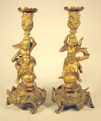 Each modeled as a putti riding a dolphin, raised on rococo circular bases on scroll feet, with alterations.