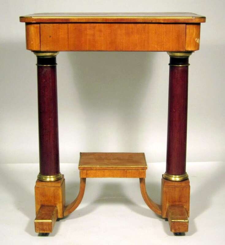 The brass banded rectangular top with single frieze drawer over two columnar supports centered by a raised platform stretcher raised on castors.