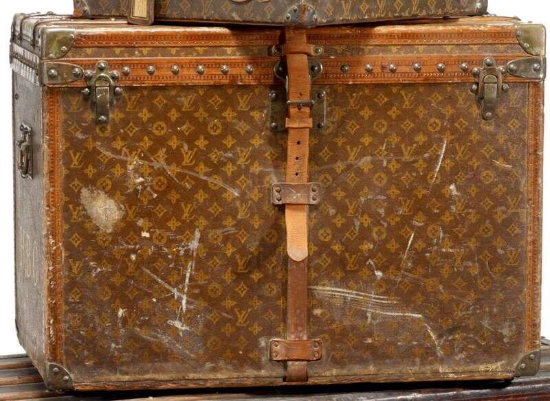 Louis Vuitton canvas, brass-mounted, leather and wood strapped travelling trunk early 20th century