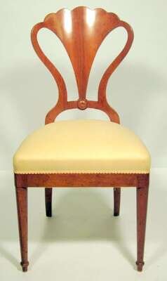 The lobed fan form back over padded seat, raised on cylindrical legs.