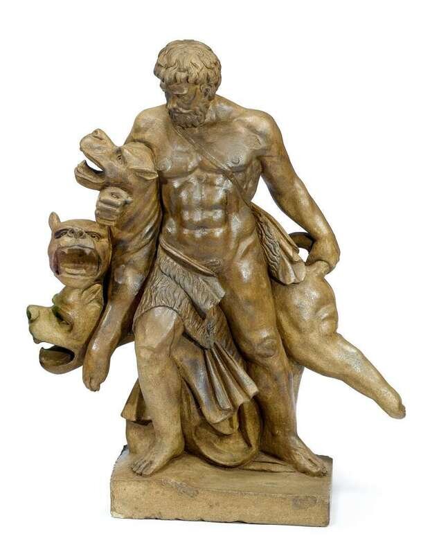 After the antique, showing Hercules grasping Cerberus under the chin and by the tail, on plinth base.