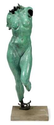 Verdigris bronze, female nude over square stone base, base signed and dated.
