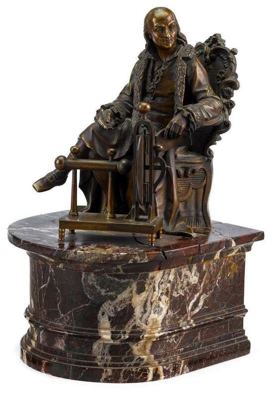 The figure of Franklin with electrical apparatus, mounted on a red marble plinth.