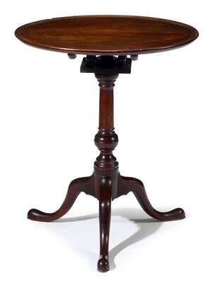 Having a circular dish molded top on birdcage tilting mechanism, slender shaft terminating in a suppressed ball, plain cabriole legs with snake head feet.