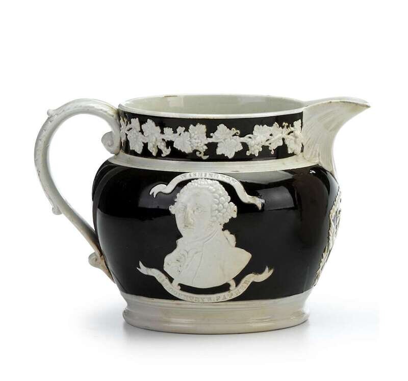 The bulbous form molded with grapeleaves and portraits of "Washington His Country's Father" and "Lafayette The Country's Guest," eagle with stars and shield under spout.