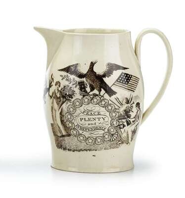 Decorated with "Peace Plenty and Independence" within ring of sixteen states on one side, an American three-masted ship on the other and "E. Pluribus Unum" the Great Seal of the United States under spout.